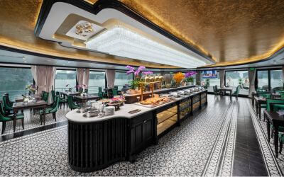 12:30: Thưởng thức bữa trưa buffet sang trọng hoặc set menu tại nhà hàng HARMONIA tầng 2 của du thuyền.