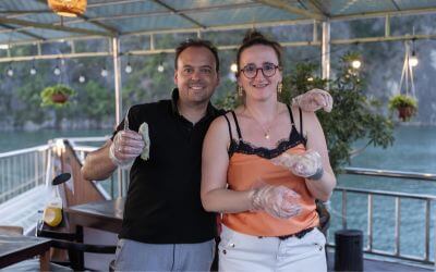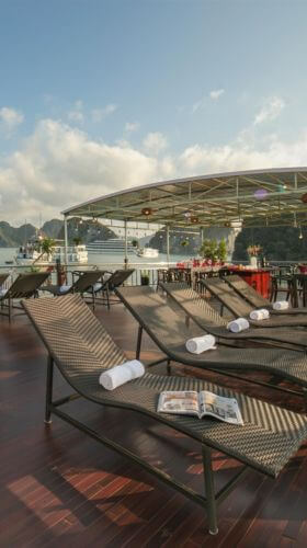 Sau chuyến tham quan, du khách sẽ trở lại tàu để thư giãn, thưởng thức hoàng hôn tại sundeck. Đầu bếp hướng dẫn quý khách gói nem tươi và ăn ngay tại tàu.