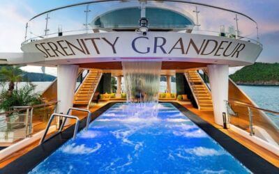Serenity Grandeur là du thuyền 5 sao hiện đại, gồm 3 tầng chính với đầy đủ tiện nghi: nhà hàng sang trọng, khu lounge, sundeck rộng rãi, quầy bar, bể bơi, bể sục Jaccuzi và phòng thay đồ riêng cho khách đi trong ngày.