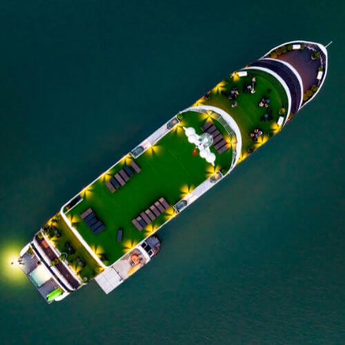 Có. Du thuyền có boong tắm nắng rộng 300m² – lý tưởng cho tiệc cưới, sinh nhật, gala dinner hoặc team building.