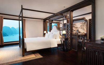 Nằm ở phía sau tầng 3 của du thuyền, các phòng Premier Suite mang đến không gian rộng rãi lên tới 55m², với hai hướng nhìn độc đáo – trực diện và bên hông, giúp du khách chiêm ngưỡng trọn vẹn vẻ đẹp của vịnh.