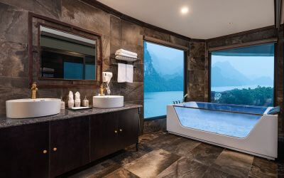 Du thuyền ngủ đêm Venus Cruise mang vẻ đẹp giao hòa giữa nét cổ điển và tiện nghi hiện đại với 29 cabin sang trọng. Mỗi phòng đều được thiết kế tỉ mỉ, mang đến không gian riêng tư và cảm giác thoải mái tuyệt đối cho du khách. Cửa sổ lớn mở ra khung cảnh toàn vịnh Lan Hạ, nơi bạn có thể ngắm trọn vẻ đẹp kỳ vĩ của biển trời. Nội thất tinh tế, ánh sáng ấm áp và phòng tắm hiện đại với bồn ngâm, vòi sen mưa giúp hành khách thư giãn trọn vẹn sau một ngày khám phá. Venus Cruise thực sự là lựa chọn hoàn hảo cho kỳ nghỉ đẳng cấp giữa thiên nhiên.